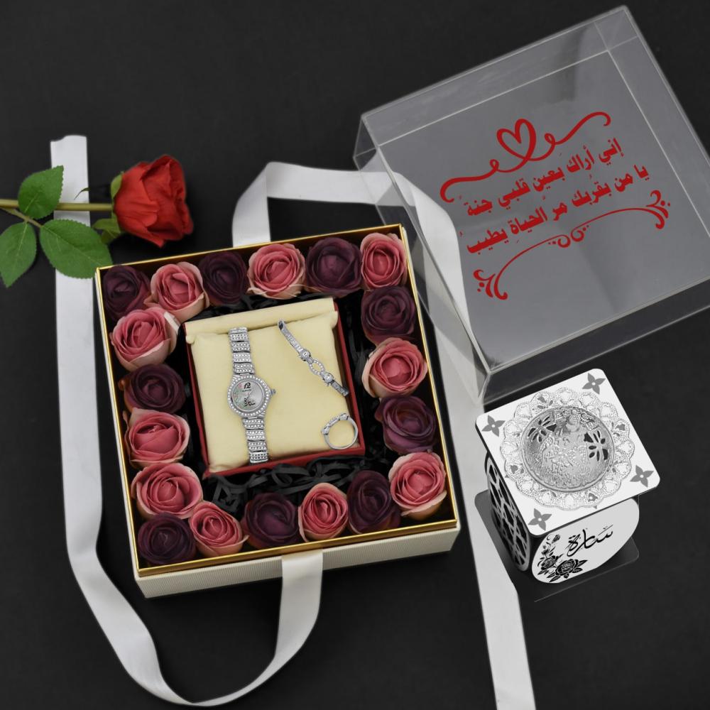 ساعة نسائي بالاسم اسواره فصوص زركون خاتم فصوص زركون بكس مميز مع تصميم العباره والاسم حسب الطلب مبخره اكليك بالاسم بوكس شفاف مع عباره