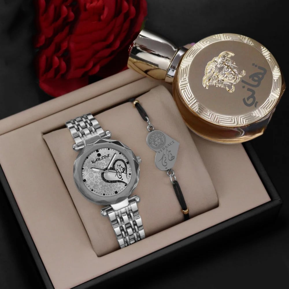 اطقم نسائي بالاسم. ساعه نسائي ناعمه بالاسم حسب الطلب.ضمان سنه يشمل الضمان-مكينه-بطاريه-ماءعطر فرزاتشي ثبات 8 ساعات بالاسم كتابة الاسم نحت ليزر حسب الطلب.اسواره سحب بالاسم كتابة لاسم نحت ليزر حسب الطلب.علبة طقم.كيس هدايا.